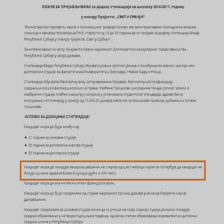 U dokumentu Ministarstva prosvete Srbije za dodelu stipendija u okviru programa "Svet u Srbiji," stoji da su studenti koji žive sa HIV-om nepoželjni. Od kandidata se traže uverenja da ne boluju od neke zarazne bolesti, uključujući i HIV, što se ne može protumačiti nikako drugačije do kao diskriminacija. U ministarstvu kažu da takva odredba postoji već šest godina, ali nije jasno ko je takvu odredbu doneo i na koga se odnosi, budući da na ulasku u zemlju niko takve dokaze ne traži