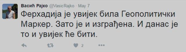 Mali Dodikov Gebels, Vasić Rajko, razočaran je obnovom minirane Ferhadije. Ništa čudno: rušenje Ferhadije Vasić smatra „geostrateškim potezom“. Jer su džamije, kaže, „znak i biljeg Turskog Osvajanja“. Sa njegovog bloga prenosimo nekoliko razularenih rečenica obmotanih u dinamit