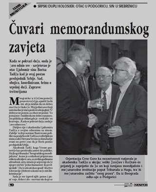 To pokazuju upravo ovih dana: Boris Tadić ponizno putuje u Srebrenicu. Ne, da u Sarajevu – gdje je 1958. godine rođen – ostvari, kao predsjednik Srbije, po novom tumačenju standarda, svoje dvostruko biračko pravo, već da klekne nad kosturnicom srebreničkih žrtava. I klečeći da, u ime nove Srbije, uz izvinjenje “ostatku zaklanog bošnjačkog naroda”, očuva ono što je Milošević na nož osvojio. A njegov otac, jedan od tvoraca srpskog nacionalnog programa nazvanog Memorandum SANU, sada u svojstvu predsjednika Sav jeta Pokreta za zajedničku evropsku državu Srbije i Crne Gore dolazi, ponosno i slavodobitno, u Podgoricu, da pod firmom demokratije, zakuči od teritorija još ponešto.