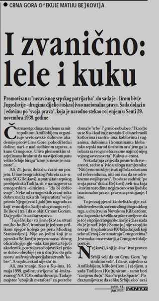 Akademik će dobiti državni tretman u Crnoj Gori, mada se zna: njegov dosadašnji trnovit put na trasi velike Srbije popločan je – zločinom. Jer: Tu gdje dođe, donese nesreću. Lele, kuku. Tako se zove jedna pjesnička zbirka Matije Bećkovića.