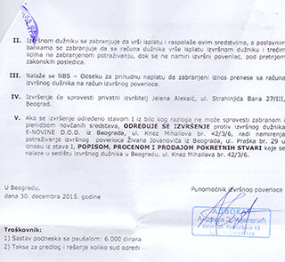 Ali, Čivtelić, u poslednjim trenucima svoje advokatske photo karijere, poslao je još jedan „Predlog za izvršenje na osnovu izvršne rasprave“, ovog puta na ime Živana Jovanovića, foto-skota, koji traži blizu 180.000 dinara; uzmi sve što ti život pruža uoči odluke Narodne skupštine. Jelena će nam još jednom aleksićevski blokirati račun; duplo golo, izvršiteljski.