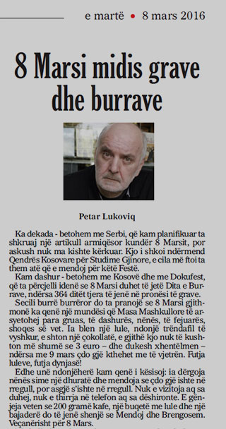 Na Dan žena, 8. marta, objavljen je Lukovićev tekst u dodatku Koha per Grate (Vreme za Žene), koji je pripremio Kosovski Centar za Rodne Studije (Qendra Kosovare per Studime Gjinore/Kosovar Center for Gender Studies), a objavljen u dnevnim novinama Koha Ditore. Prenosimo albansku i srpsku varijantu teksta Petra Lukovića, tek kao da dokaz da jezici, narodi, novine, kolege, i Dani žena mogu egzistirati između dve susedne, verujemo – prijateljske države. Čitaocima koji pitaju zašto s Kosova nisu zvali Feralovku Cecu Lukić – već omraženog Lukoviqa, ne znamo šta da kažemo: life’s a bitch, naročito kad je Koha per Grate…