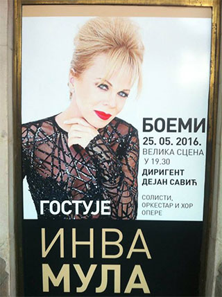 Svetski poznata albanska operska pevačica, sopran Inva Mula, nastupila je u Beogradu u sredu, 25. maja, sa ansamblom Nardnog pozorišta, pod dirigentskom upravom Dejana Savića, u okviru Protokola o saradnji Nacionalnog teatra, opere i baleta iz Tirane i beogradskog Narodnog pozorišta
