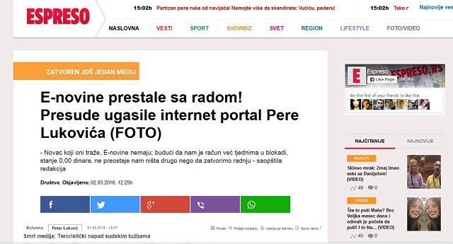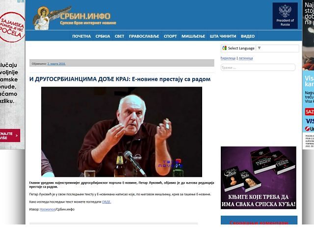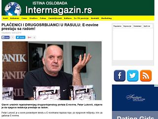 16.12. Fašistički tabloid Intermagazin.rs, čiji je vlasnik Ratko Dmitrović, s oduševljenjem dočekali zatvaranje e-novina, evo šta pišu – „Glavni urednik najekstremnijeg drugosrbijanskog portala E-novine, Petar Luković, objavio je da njegova redakcija prestaje sa radom. Petar Luković je u svom poslednjem tekstu u E-novinama napisao koje, po njegovom mišljenju, kriv za gašenje E-novine“. Jebote: najekstremniji, pa još drugosrbijanski! E, pa dođe mi da se ne ugasimo samo zbog Intermagazina.rs!