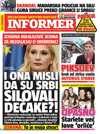 Tamo su trenutno (da se proveriti: informer.rs) Top Priče (tako se zove rubrika, koliko vidim): JELENA GOLUBOVIĆ NE ODUSTAJE OD TELEVIZIJSKE SLAVE: Rodiću – OVO JE I DALJE NAJGLEDANIJI PORNIĆ NA SVETU – (HOT FOTO) MESI OVU GUZU NE SMEŠ DA ODBIJEŠ – ZAŠTO JE CIA UBILA KENEDIJA itd isl… A sa desne strane se vidi šta Informer donosi sutra: osim trivijalnosti udarna tema je Putin – Srbiji preti ukrajinski scenario. Dakle, guzice, sise, rijaliti šou programi, teorije zavere, Vučić i Bog Putin, tamo nikada nema ništa drugo.